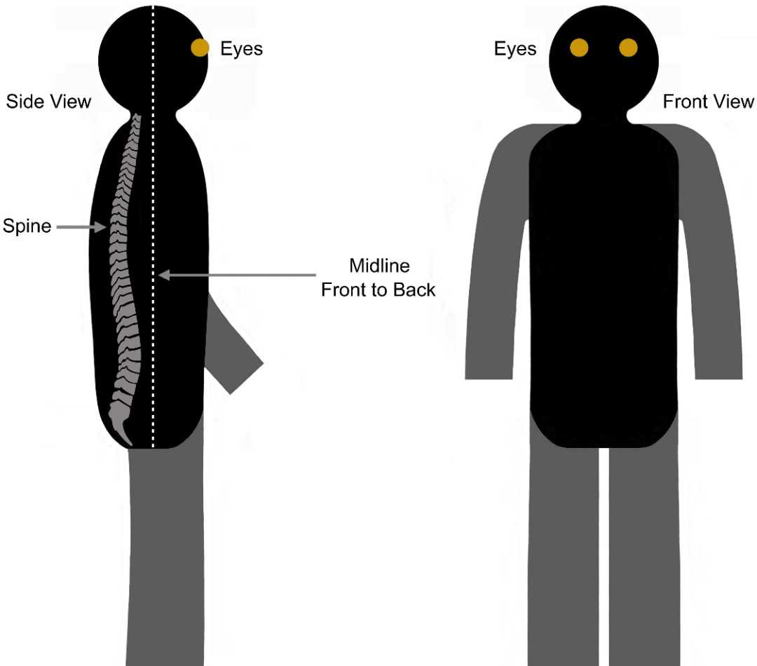 Because vision is so critical to navigating the perceived world, it’s not surprising that the sense of self often migrates forward to the area around the eyes.  Notice in the graphic below that the eyes are located at the front of the body, well beyond the body’s midline.  This is obvious to the thinking mind.  But as we’ll see later, it’s useful to experience this spatial relationship as an actual sensation.  Also, notice that the arms and legs are “grayed out” below.  The technique focuses on the head and torso, the only areas of the body needed for rediscovering your true depth and your vertical orientation.